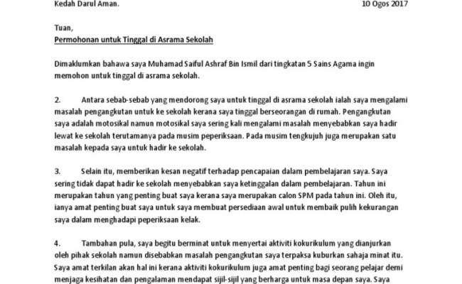 Cyrillyne mark madinah kampung mempakad laut peti surat 441 89107 kota marudu . Contoh surat rayuan untuk memohon penempatan di asrama, terutamanya untuk pelajar yang berasal daripada keluarga miskin dan kurang berkemampuan. Surat rasmi permohonan kemasukan ke asrama contoh raw x cute766. 07 apr, 2021 posting komentar. 2758, lorong 53, taman ria,. 08000, sungai petani, kedah darul aman.